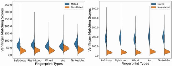 Distributions of Verifinger matching scores with the AMSL SynFP P2P v1 (left) and AMSL SynFP P2P v2 (right) datasets for different fingerprint basic patterns considered separately.