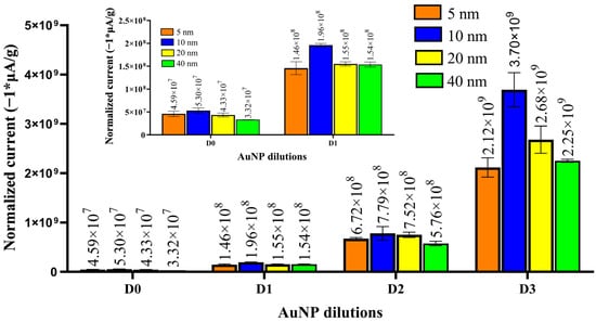 Normalized EC peak current (SWV) was obtained for different sizes of AuNPs (5, 10, 20, 40 nm) at different dilutions (D0 = 1.4 × 108, D1 = 1.4 × 107, D2 = 1.4 × 106, and D3 = 1.4 × 105 AuNPs in 2 μL of DI water). The inset shows the normalized EC plots for dilutions D0 and D1 for clarity. Error bars represent standard deviation (n = 3). A 0.24 μA peak current (n = 3, standard deviation = 0.014) was obtained for the control (2 μL of DI water, no AuNPs). The mean values of normalized current are labeled above the columns.