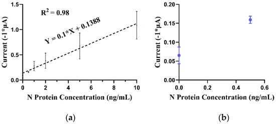 (a) EC DPV peak current corresponding to varying concentrations (0–10 ng/mL) of N protein in 500 μL of PBS buffer (linear regression curve). (b) Subset of the EC DPV peak current corresponding to N protein concentration (in 500 μL of PBS buffer) in a 0–0.5 ng/mL concentration range. Error bars represent standard deviation (n = 3).