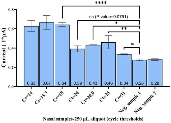 EC (DPV) peak currents corresponding to human nasal samples obtained from SARS-CoV-2-infected patients (three different cycle thresholds representing varying viral load; analyzed volume = 50 μL). The negative samples (nasal samples from healthy patients) represent the control. Error bars represent standard deviation (n = 3). The mean values of peak current are labeled above the columns. The asterisk (****) denotes different probability values as per the GraphPad style (see Supporting Information, Table S1).
