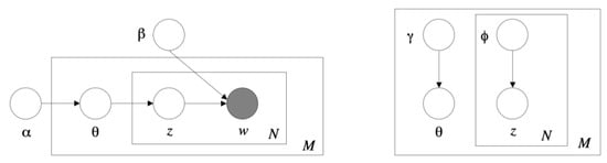 One of the various topic modeling methods available is LDA, which is a probabilistic graphical model proposed by Blei et al. (2003) [36] that estimates the probability of word inclusion in a particular topic using a Dirichlet distribution. In LDA, a corpus, which is the collection of documents under analysis, is assumed to consist of multiple topics. The distribution of words corresponding to each topic within the corpus determines the topics assuming that the words inferring a latent topic are fixed. This method groups correlated words into a single topic, enabling the inference of latent topics based on words assigned to the same group [36,37].