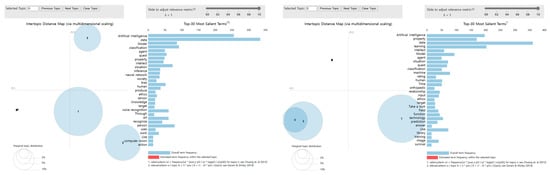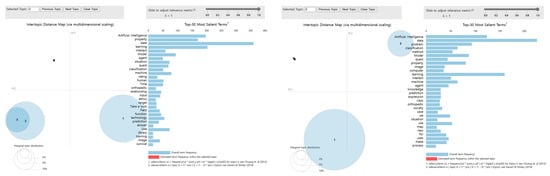 First, the topics in each textbook were categorized into two or three distinct groups. None of the textbooks shared identical topics. Two textbooks consisted of two topics, while the remaining six contained three topics. Textbook (D) had two overlapping topics that were similar among the six textbooks with three topics, indicating low discriminant validity (Figure 4). Second, the topic size significantly influenced the data weight. There was a noticeable disparity in topic size between textbooks B and H, which featured two topics, with one topic accounting for a higher proportion of keywords than the other. Third, the evaluation results for curriculum consistency varied for each topic. In some cases, a single curriculum included multiple topics. For example, in textbook A, the topics were categorized into ((2,3), (1,4), (2)) sections of the curriculum, whereas textbook B’s topics were grouped into ((2,3), (1,2,4)), with multiple topics falling under “2. The Principles and Applications of AI”. The topics in textbook H were classified into ((4), (1,2,3)), wherein “4. The Social Impact of AI” consisted of one topic, whereas the other three areas each had one topic.
