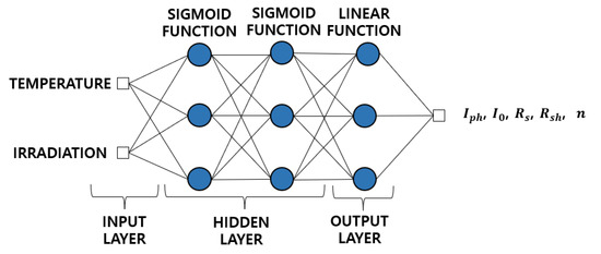 The simulation proceeds in the following sequence: (1) the existing experimental data of the five parameters are implemented in a three-dimensional graph. (2) The five parameters are trained using an artificial neural network. (3) The consistency between the existing experimental data and the trained data is verified. (4) The trained data are generated as a Simulink block to construct a solar cell. A Simulink block generates results learned through the MATLAB code for an artificial neural network [7,10]. (5) The constructed solar cells are connected in parallel with bypass diodes to create a photovoltaic module. The five parameters and the artificial neural network are simulated using MATLAB/Simulink v.R2023a. Each of the five parameters is defined as a function of the temperature and irradiation. Therefore, the inputs of the neural network are set to the temperature and irradiation, while the outputs are set to each of the five parameters. The settings for training the neural network for each parameter are the same and are as follows: the maximum number of training epochs is 1000; the performance goal is ; and the learning rate is 0.05. The hidden layer has two layers, and each of them has three nodes. For the activation functions, the sigmoid function is used in the hidden layers, while the linear function is used in the output layer. Finally, the Levenberg–Marquardt (LM) algorithm was used as the learning algorithm. The LM iteration approach is a numerical optimization algorithm to solve nonlinear fitting problems using the method of least squares. The number of iterations is set to 1000, but the process terminates when the loss reaches the performance goal.