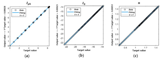 The regression analysis results in Figure 3a–e are explained as follows. In the graph, the data represent the actual value, while the fitting represents the predicted values. First, from a scatter plot analysis perspective, it can be observed that scatter points are distributed around the regression line. Secondly, from a regression line analysis perspective, it can be observed that the slope of the regression line in the graph is close to 1, indicating a high level of accuracy in the predictions. Lastly, from an error analysis perspective, the difference between the data and the fitting remains relatively constant. The important aspect to consider when training with five parameters is the diode saturation current. The diode saturation current is typically very small, on the order of , which can cause difficulties in the artificial neural network training process. To address this issue, the calculated diode saturation current is transformed by taking the logarithm before proceeding with the training. After the training is completed, the trained results can be visualized in a three-dimensional graph by reversing the logarithmic transformation. This can be achieved by applying the exponential function to the transformed values. The results of performing steps 1 to 3 in the simulation sequence are represented by Figure 4, Figure 5, Figure 6, Figure 7 and Figure 8.