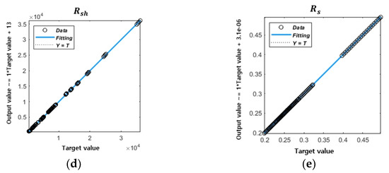 Regression analysis is used to model the relationship between a dependent variable and one or more independent variables. In this study, regression analysis is employed to analyze the data obtained from a neural network. In regression, the dependent variable represents the variable to be predicted, while the independent variable are the variables that influence the dependent variable. In this research, when constructing the training data for regression analysis, temperature and irradiation are used as independent variables, and the five major parameters corresponding to them are used as the dependent variable. The regression model is trained using the training data, and then this model is utilized to predict the values of the five parameters based on new temperature and irradiation inputs. Regression analysis results can be interpreted using methods such as scatter plot analysis, error analysis, etc. Scatter plot analysis represents the relationship between actual values and predicted values of a graph in the form of a scatter plot. By analyzing the scatter plot, it can be determined if the data points cluster around the regression line. If the data points are concentrated around the regression line, it indicates that the model accurately predicts the relationship between the actual values and predicted values. Regression line analysis represents the relationship between the actual values and predicted values as depicted by the regression line on the graph. The slope of the regression line can be used to evaluate the predictive accuracy of the model through correlation. Generally, a slope close to 1 indicates an accurate model where actual values and predicted values match. Additionally, it is desirable for the data points around the regression line to be clustered. Error analysis allows us to examine the predicted values and actual values through the graph. If the data points are not concentrated around the regression line or show significant deviations, it may indicate that the predictive model is inaccurately predicting some of the data. The analysis of errors allows us to assess the predictive accuracy and bias of the model. The results of the regression analysis with five parameters are presented in Figure 3a–e.