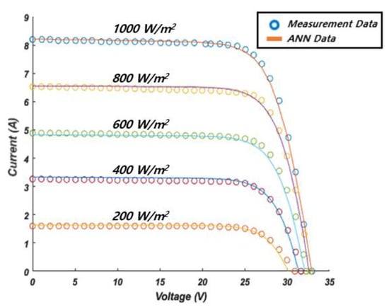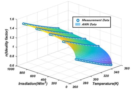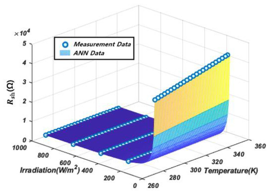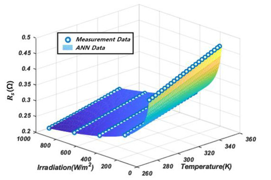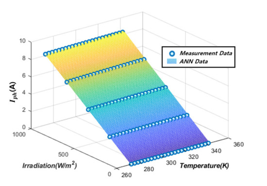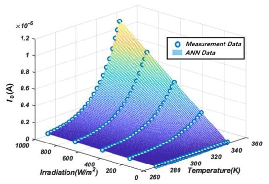 Figure 4, Figure 5, Figure 6, Figure 7 and Figure 8 show the mesh plots for the data used to train the artificial neural network; the data represented by the blue dots are the data from the KC200GT model [18]. The training data are generated by simulating various combinations of temperature and irradiation to create input data. In the previous research, each function composed of temperature and irradiance was separately presented in graphs representing temperature and irradiance. When combining both temperature and irradiance into a single graph, a three-dimensional graph like Figure 4, Figure 5, Figure 6, Figure 7 and Figure 8 is plotted, showing the relationship between the two variables. It can be seen in Figure 4, Figure 5, Figure 6, Figure 7 and Figure 8 that two sets of data match in the three-dimensional graphs, implying successful training for each parameter. The KC200GT model is a multi-crystalline solar module. The detailed parameters of the KC200GT module under normal operating conditions are , , , and [9,19]. The training data were compared with the I–V characteristics curve of the KC200GT model under standard conditions, as shown in Figure 9 [7].
