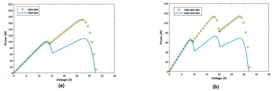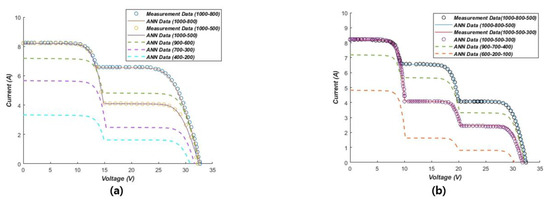 Figure 12a corresponds to a model with two bypass diodes connected, whereas Figure 12b corresponds to a model with three bypass diodes connected. The data represented by the lines are the ANN data. Taking into account some errors generated in the parameters and the graph-extraction process, the measurement and ANN data are consistent. This study focuses on irradiation, and Figure 12a,b illustrate the results of varying the irradiation inputs of for each artificial neural network model in Figure 11. By using Figure 12a,b, it is possible to plot the P-V characteristic curves of Figure 13a,b. It can be observed that the number of cells divided by the bypass diode corresponds to the occurrence of MPPs.