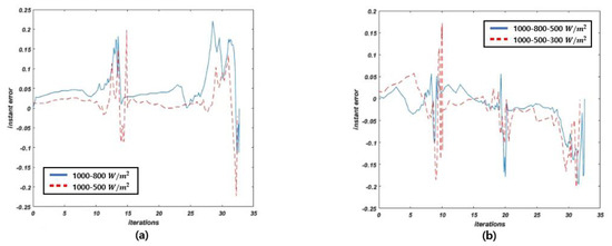 where is the number of the data point, is the measurement value of the th data point and is the ANN value of the th data point. Figure 14a shows the differences between the measured current and the predicted current of the model with two connected bypass diodes for an input of 1000–800 and 1000–500 . The differences between the measured current and the predicted current are shown in Figure 14b, when the model with three connected bypass diodes is utilized for an input of 1000–800–300 and 1000–500–300 .