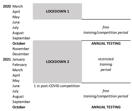 In 2020 and 2021, the annual testing of tennis players was conducted 5 months after the end of the first lockdown (Figure 1). During these 5 summer months, the young tennis players trained at a normal level (as before the COVID-19 pandemic) and participated in national and international junior tournaments.