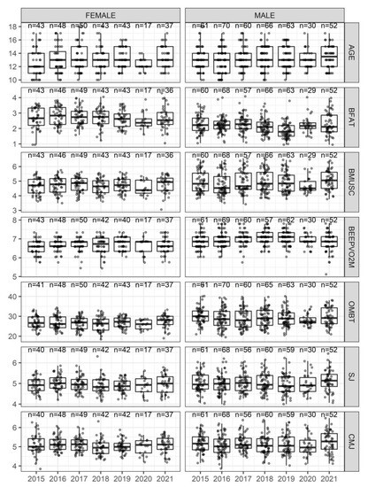 Boxplots for age and the six main (square-root transformed) outcomes (different rows), with respect to gender (two columns) and year (x-axes). Note: Individual data points are superimposed over descriptive statistics. Data points are jittered to prevent overplotting. AGE—athlete chronological age; BFAT—body fat mass; BMUSC—body muscle mass; OMBT—overhead medicine ball throw; BEEPVO2M—20 m shuttle run test; CJM—countermovement jump height; SJ—Squat jump height.