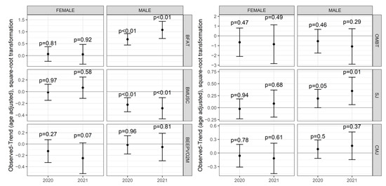 The difference between the age-adjusted effect in 2020 and 2021 and the age-adjusted predicted effect in 2020 and 2021 by sex with corresponding 95% confidence intervals and p-values. Note: The y-axis shows the estimated (age-adjusted) difference between the observed and predicted effect based on the estimated pre-COVID, non-linear trend, applying the square-root transformation to outcomes. Positive (negative) values of the contrast suggest that the age-adjusted outcome in a particular year (2020 or 2021) was larger (smaller) than that predicted by the age-adjusted, pre-COVID, non-linear trend. BFAT—body fat mass; BMUSC—body muscle mass; OMBT—overhead medicine ball throw; BEEPVO2M—20 m shuttle run test; CJM—countermovement jump height; SJ—Squat jump height.