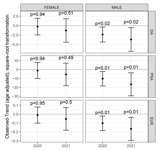 The difference between the age-adjusted effect in 2020 and 2021 and the age-adjusted predicted effect in 2020 and 2021 by sex. Positive (negative) values of the contrast suggest that the age-adjusted outcome in a particular year (2020 or 2021) was larger (smaller) than that predicted by the age-adjusted, pre-COVID, non-linear trend. Note: DA = direct comparison; PSA = Pre-stretch Augmentation; EUR = Eccentric Utilization Ratio.