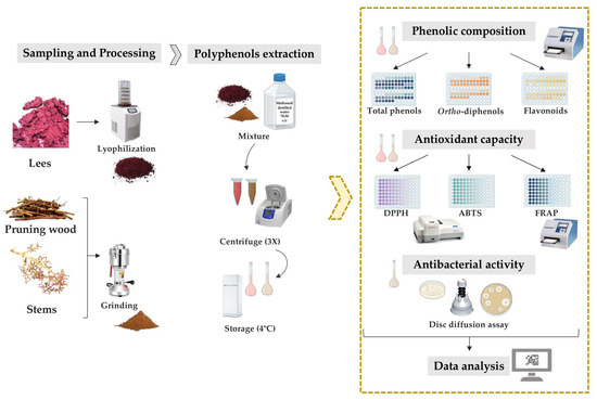 For the comprehensive analysis of phenolic compounds and antioxidant activity, our sampling strategy encompassed three crucial by-products: pruning firewood, stems, and lees. These by-products were meticulously gathered from a selection of six autochthonous Vitis vinifera varieties indigenous to the Demarcated Region of Dão. Among these varieties, four were of the red wine category, namely Touriga Nacional, Tinta Roriz, Alfrocheiro, and Jaen, while the remaining two were distinct white varieties, Borrado das Moscas and Encruzado. As for the assessment of antimicrobial activity, we narrowed our focus to the by-products of two of the red varieties (Alfrocheiro and Jaen) and the white variety Borrado das Moscas.