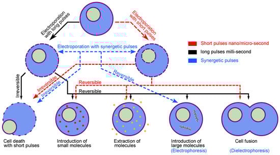 The breakdown of cells depends on many parameters including the ambient temperature, pulse duration, and cell charging time constant. By varying the pulse properties, a potentially infinite number of applications can be targeted based on project requirements. Different applications of electroporation based on low-voltage long pulses, high-voltage short pulses, and synergetic pulses achieved by mixing both long and short pulses are shown in Figure 2 and summarized in Table 3. Cancer electrochemotherapy utilizes RE to initiate pores and allow drugs to enter the cells; the pores then reseal after a period of time []. Cancer treatment methods based on the utilization of IRE to cause permanent damage to tumour cells have been reviewed in [,]. In another context, PEF is used in food processing to kill bacteria in order to preserve food for long periods of time with reduced need for chemical food preservatives []. There are many pulse waveforms that solid-state-based PG can generate if the electroporator is based on multilevel techniques []. These pulse waveforms are rectangular, exponential, and multipulse. The most utilized technique for food processing is the application of multipulse waveforms, which reduces amount of heat generated in order to maintain the nutritional value of food []. Electroporation has additionally been used as an emerging technology to enhance the extraction of juice from various types of fruits, as well as other plants such as olives and sugar beets [].