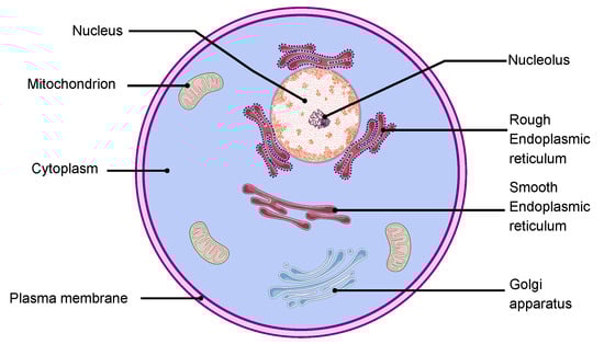 A eukaryotic cell is the basic building block of any living organism, and is a very complicated biological entity. The cell is composed of cytoplasm, which contains the nucleus, mitochondria, and many other organelles; a detailed view is shown in Figure 3. Organelles have different functionalities, and all are necessary for the proper functioning of the cell. The cytoplasm and cell organelles are surrounded by a plasma membrane composed of a phospholipid bilayer and transmembrane proteins (etc.); the membrane plays a vital role in protecting organelles while at the same time controlling the exchange between the extracellular microenvironment and the inside of the cell.