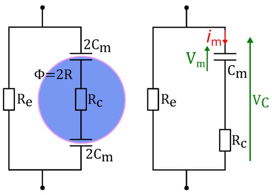 The equivalent electrical cell model was presented by Foster and Schwan in 1989 []. Considering a mammalian cell, the internal structure of the cell is depicted in Figure 3. The plasma membrane of the cell is a perfect dielectric material; it has high resistance and extremely low thickness, being only a few nanometres (5∼10 nm). The approximate values of resistivity and capacitance are and , respectively []. On the other hand, the cytoplasm has higher conductivity than the plasma membrane, and is modelled as a resistor . The resistivity of the cytoplasm is around []. The surrounding medium, like the cytoplasm, is of higher conductivity, and is modelled as a resistor . Overall, a cell can be modelled as a conductive sphere covered by a layer of insulating material, as shown in Figure 4.