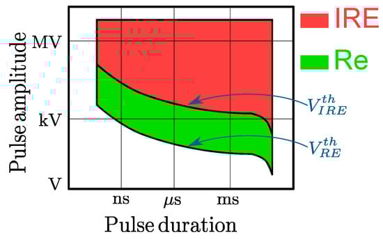 To electroporate the cell and temporarily increase cell permeability, the value of the pulse peak should exceed the lower value required to achieve RE () at a specific pulse duration. If the voltage value decays beyond the RE lower limit during the pulse, the permeability of pores will be lower and they will reseal faster. The same applies for IRE; thus, in order to produce permanent pores, the lower limit () should be exceeded for the minimum pulse duration. Pulses with parameters in the area between the thresholds of RE and IRE lead to large pores, which can be useful for the insertion/extraction of molecules into/from the cell [].