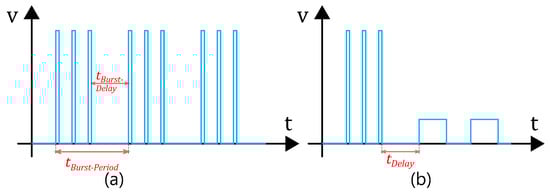 It is rare that any application needs only one voltage pulse to be delivered to the load. Rather, voltage pulses are delivered in series through a train of pulses with different numbers and repetition frequencies, which can be combined into different shapes to obtain a better effect. Figure 9 shows voltage pulses divided into many trains of pulses with the same pulse parameters and with delay time inserted in the first part; the second part shows trains of pulses that share the same parameters in the same group and have different parameters in the second group.