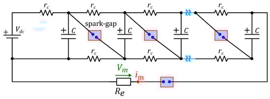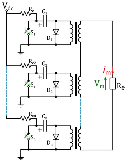 - Sakamoto, T.; Nami, A.; Akiyama, M.; Akiyama, H. A repetitive solid state Marx-type pulsed power generator using multistage switch-capacitor cells. IEEE Trans. Plasma Sci. 2012, 40, 2316–2321. [Google Scholar] [CrossRef]
