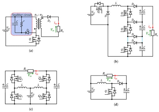- Elserougi, A.; Ahmed, S.; Massoud, A. A boost converter-based ringing circuit with high-voltage gain for unipolar pulse generation. IEEE Trans. Dielectr. Electr. Insul. 2016, 23, 2088–2094. [Google Scholar] [CrossRef]