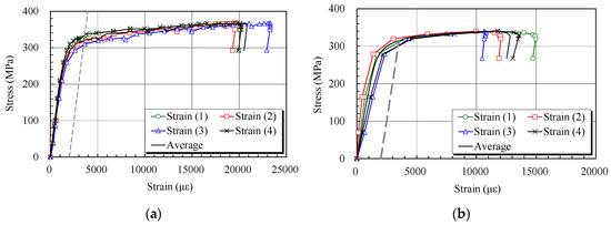Stress–strain relationship of steel pipes: (a) cross section was ø48.1 × 2.1; (b) ø59.9 × 2.3.