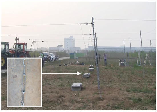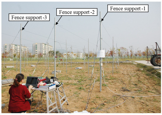 Figure 4 show ground plans of the fence support and matrix support, respectively, where load represents the loading direction. The fence support connected the end post (ø59.9 × 2.3t) and line post (ø48.1 × 2.1t) with four trellis wires (ø2.38), and two strut wires (ø4.76) were additionally used to tighten the support to the ground at both ends. Since the actual wind load fluctuated randomly and was hard to apply to the field site, it was simulated by installing chain blocks to each support with connection hardware based on the principle of a pulley. The loading point of the fence support was 1300 mm above the ground, and the load cell and linear variable displacement transducer (LVDT) were installed on each support at the same height.