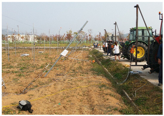 Figure 13 shows the test set-up of the matrix support system. The performance test of the matrix support involved the same procedure as the fence performance test. When the first test type collapsed, it was removed to test on the next test type until it collapsed. The performance test of the matrix support system continued up to the point of displacement, 587.31 mm at the time of the apple tree collapse.