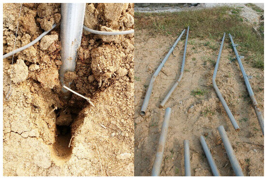 Figure 7 shows the test set-up of the fence support system. Assuming that the wind load acting on the apple tree was transferred from the wire supporting the tree to the line and end post, an equivalent static test was performed by pulling each post. Loading was applied while continuous monitoring of the load cell and LVDT was performed in order to prevent eccentricity. The collapse test of the fence support was carried out to induce the displacement of the apple tree collapse (over 238.59 mm). When the first test type collapsed, it was removed to subject the next support to the collapse test, and the procedure was repeated.