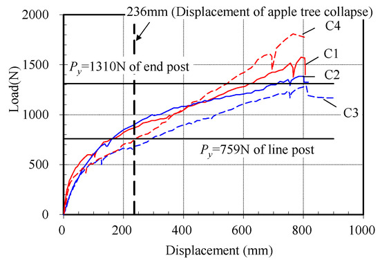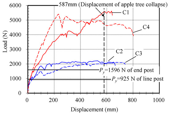Figure 10 shows that a line post (C3) reached the yield load at the displacement of the apple tree collapse, whereas other line posts (C2) and end posts (C1 and C4) did not. In particular, the first fence support test manifested a lack of bearing capacity of the ground. This is explained by the tractor compaction of the ground for the first test type not being satisfactory because the location was near drainage. Generally, the line and end posts of the first support test exhibited linear behavior up to 500 N. As the load increased, a second linear behavior was observed prior to reaching the yield load due to the aforementioned lack of bearing capacity of the ground. The test ended at the load above the yield load to observe the plastic hinge behavior of the support pipe. However, the displacement had already reached over the displacement at the time of apple tree collapse, requiring the consideration for reducing effect of the ground condition state during the design of the support system. Therefore, the linear trend around the load of 455 N (60% of the yield load for line post) was to be applied in consideration of the bearing capacity of the ground for the case of the line post. Although the end post manifested the same first linear trend as the line post, it exhibited a load of 786 N, which was 60% of the yield load for the end post, at the same displacement of the apple tree collapse. Therefore, the same reduction in the yield load as the line post was applied during the design of the end post system.