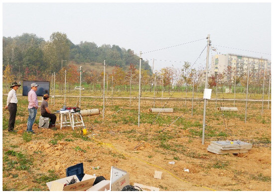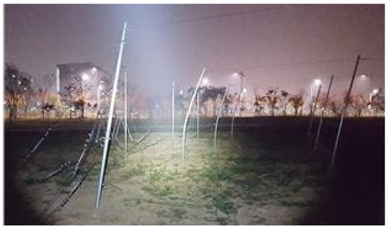 10]. Therefore, a plan was made to install one line post for every three dwarf apple trees and support posts with a height of 3.2 m at 6 m intervals. The matrix support was made up of three fence supports in parallel to one another and affixed with matrix horizontal wires (mat wire, ø3.97). The spacing between rows of apple trees was wider than the spacing between apple trees in order to increase workability and productivity. In the matrix support system, it was set to 4 m to secure sufficient space for the worker.