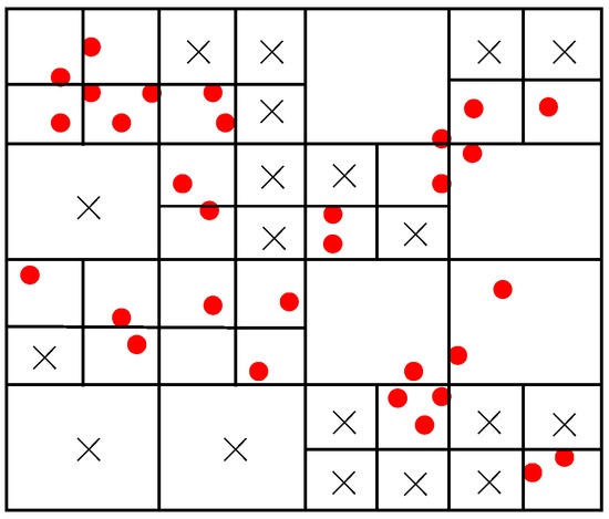 Similar to [10], we additionally partition the feature points using the quad-tree approach to ensure that they are distributed equally. We initialize the nodes of each layer of the pyramid image, divide the image into four regions, and obtain four sub-nodes. We count how many feature points are present in each node. If a node does not include any feature points, it should be deleted; if it has just one, it ought to be marked as a leaf node, saved, and no longer split; if the node contains multiple feature points, it is called the parent node and continues to be divided. If all the current nodes are non-repartitionable or the sum of the number of leaf nodes and the number of parent nodes that need to continue to be partitioned reaches the requirement of the number of feature points, the partition is terminated. We retain the feature points in each node area with the largest response value. The division outcome for a target of 20 feature points is depicted in Figure 3, where the red dot is the feature point and the area of the fork is the deleted node area.