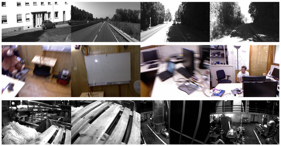 Overall, these three datasets are rich in content. Different acquisition equipment is used by them, including autonomous driving equipment, handheld equipment, and flight equipment. It covers a range of scenarios, such as different moving speeds, changing illumination, motion blur, etc. These datasets possess considerable authority in this area and are capable of thoroughly evaluating the algorithms suggested in this work, taking into account the numerous SLAM application situations. Figure 5 shows examples of images included in the three datasets.
