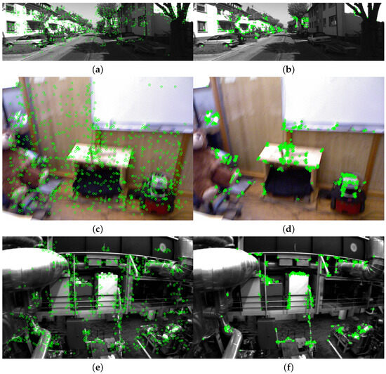 This graph shows the comparison of the feature extraction outcomes. (a,c,e) are the results of the features extracted using the algorithm of this paper in the KITTI dataset, in the TUM fr1 sequence, and in the EuRoC MH01 sequence, respectively. (b,d,f) are the outcomes of features extracted applying the conventional ORB algorithm in the KITTI dataset, in the TUM fr1 sequence, and in the EuRoC MH01 sequence, respectively.