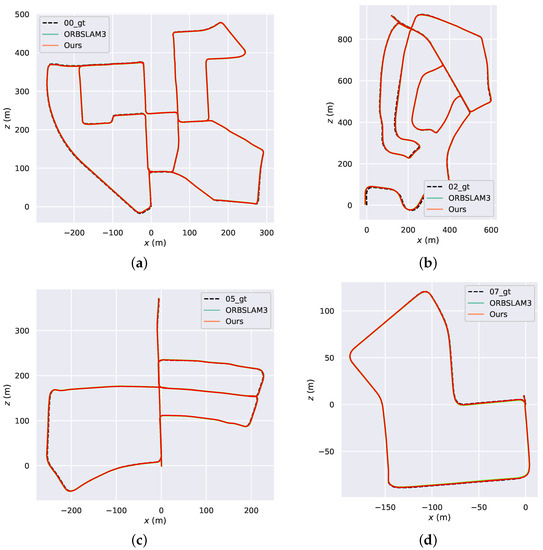 Comparison of trajectories on the KITTI datasets, where (a–d) are results on sequences 00, 02, 05, and 07, respectively. The black line represents ground truth.