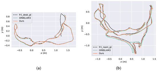 Comparison of trajectories on the TUM RGBD datasets. (a,b) are results on sequences fr1_desk and fr1_room, respectively. The black line represents ground truth.