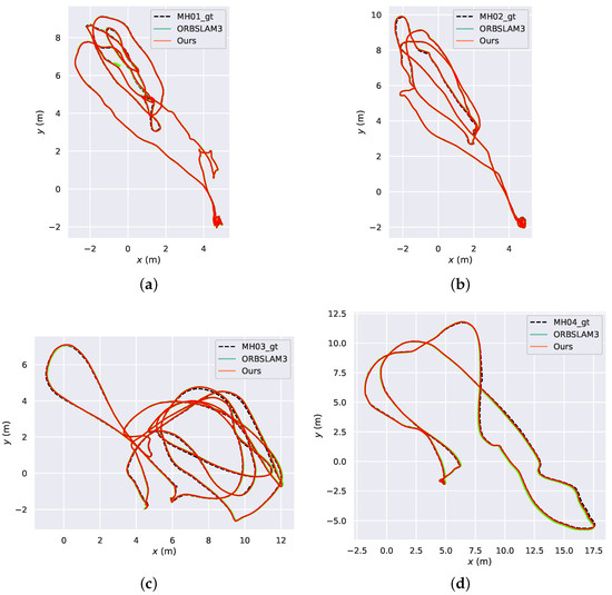 Comparison of trajectories on the EuRoC datasets. (a) comes from the simple sequence MH01. (b) comes from the simple sequence MH02. (c) comes from the medium sequence MH03. (d) comes from the difficult sequence MH04. The black line represents ground truth.