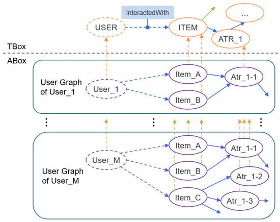 To understand the preference of each user, we divided the expanded KG into multiple user graphs. A user graph is a part of a KG wherein only the items that each user has interacted with and their related triples are connected; each user has only one user graph. Figure 3 conceptually illustrates an example of a user graph; User_1 interacts with two items, and User_M interacts with three items. It should be noted that the user graph contained not only instance-level triple information but also information on the class to which each instance belonged.