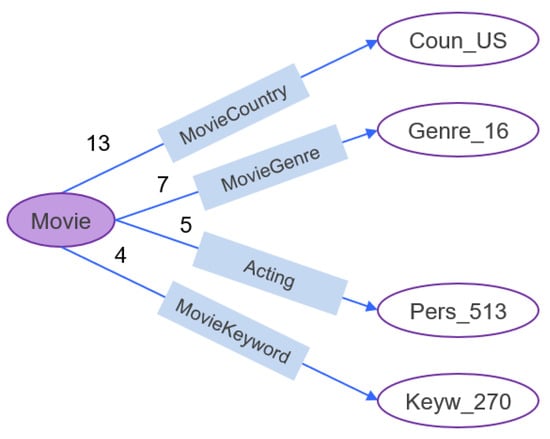 The resulting set of subgraphs comprised common triples belonging to the items that a user commonly interacted with. Figure 4 shows a simple example of an extracted subgraph applied to a movie domain. As a movie is an item, it is abstracted. The numbers next to the properties indicate how many times there have been interactions with the movie with the corresponding triple.