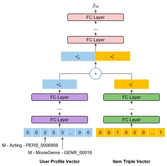 The structure of the proposed neural network is shown in Figure 5. A pair of vectors at the bottom represents a user profile vector and an item triple vector. The user profile vector in the example can be interpreted by itself; the frequent subgraph of the user contains two triples wherein PERS_0006908 (“Marc Macaulay”) participates as an actor and three triples wherein GENR_00018 (“Drama”) is the genre.