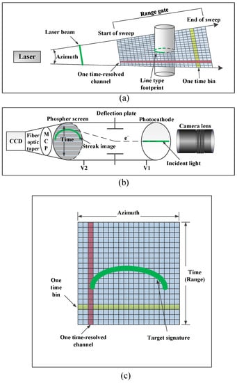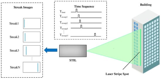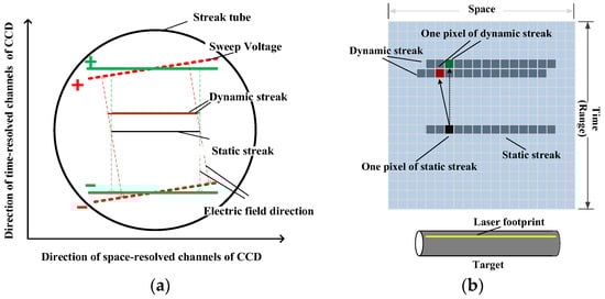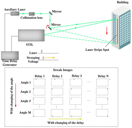 A typical schematic of the STIL system is shown in Figure 1. The laser is shaped into a fan beam by a cylindrical lens and forms a thin strip footprint on the target. The returned optical signal from the target is collected by the receiving optical system and imaged on the photocathode of the streak tube, and then the optical signal is converted into electrons. When the electron beam is accelerated toward the phosphor screen by a high voltage between the two ends of the streak tube, it is deflected by a pair of linear sweep voltages. Finally, the electrons hit the screen of the streak tube and form a streak image [10]. The signature position in a time-resolved channel on the screen is relative to the arrival time of the signal; that is, we can obtain the target distance from the image [11,12,13]. Usually, images are intensified by a microchannel plate(MCP) and recorded by a charge-coupled device (CCD) [14,15]. The horizontal position represents the spatial information of the target, while the vertical position represents the distance information in Figure 1.