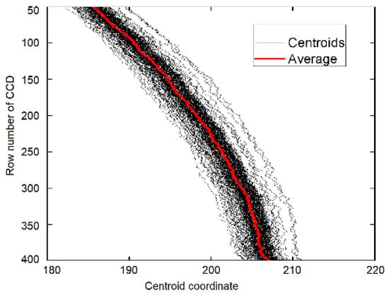 In Equation (3), is the average of the centroids in the jth row; S is the number of streak images with the same delay time of sweeping voltage; S = 2000 here; and xj,s is the centroid in the jth row of the sth image.