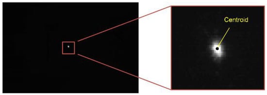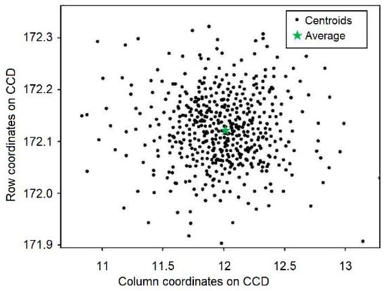 Similarly to Equation (3) and Figure 7, we took the average of the horizontal and vertical coordinates of all centroids under the same delay and angle to reduce the calibration error, and one of the averages is shown in Figure 10. The black points are the centroids, and the green star is the average of the centroids.