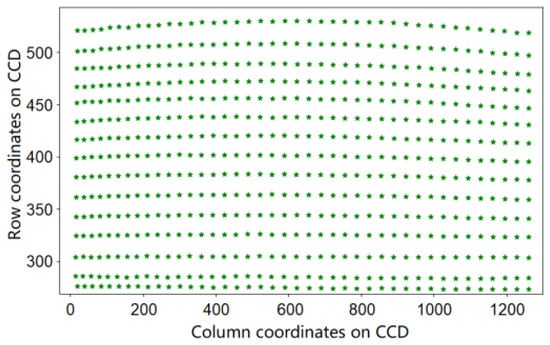 Figure 11 shows the result after thinning because an overly dense point array is not conducive to observing the arrangement phenomenon described in the previous paragraph. However, during the actual calibration process, we aimed to obtain a denser matrix by two-dimensional interpolation, such that a point that falls at any position on CCD can be indexed to its angle value. We found that these points had both angle and time information, but we did not use these points for time calibration because the light source was an auxiliary laser rather than the laser of the lidar. There is a time jitter that cannot be ignored between the auxiliary laser and the lidar.