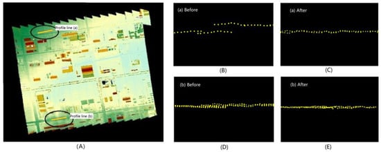 (A) Three-dimensional point cloud of a town, (B) the section at profile line (a) before calibration, (C) the section at profile line (a) after calibration, (D) the section at profile line (b) before calibration, and (E) the section at profile line (b) after calibration.