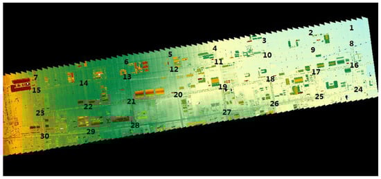 To evaluate the measurement errors before and after calibration, we measured the geographic coordinates of the 30 points listed in Figure 13 with a Leica Viva GS16 GNSS receiver. We took the measurement results of Leica Viva GS16 as the reference values and compared the point cloud data with them. We found that the range error (here, the root mean square error) of the point cloud after calibration was reduced from 0.41 m to 0.27 m.