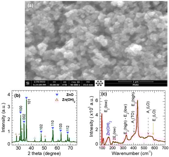 (a) SEM images, (b) X-ray diffraction pattern, and (c) Raman spectra of ZnO nanoparticles.