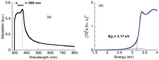 Figure 4a displays the UV-Vis absorption spectrum of ZnO NPs. The spectrum exhibits strong absorption in the UV range < 400 nm, with the absorption peak at 366 nm assigned to the intrinsic band-gap absorption of ZnO [46]. The absorption peak at 366 nm is a characteristic of the hexagonal wurtzite ZnO structure. Further, ZnO NPs’ UV-Vis spectrum reveals a blue shift compared with defect-free ZnO (368 nm) [47,48], probably due to the quantum size effect.