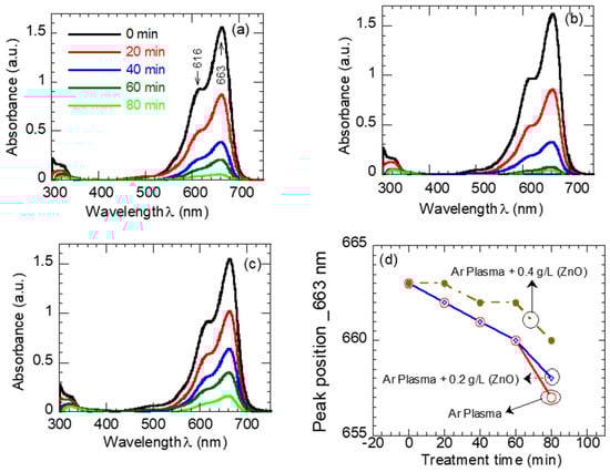 Absorption spectra of MB dye (a) sole plasma exposure, (b) plasma + 0.2 gL−1 ZnO, (c) plasma + 0.4 gL−1 ZnO solution mixture, and (d) the position of the MB absorption peaks as a function of exposure time.