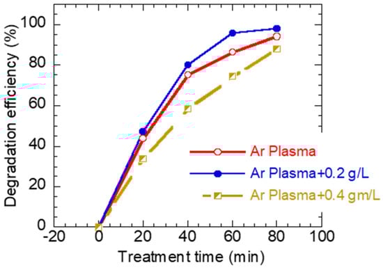 To quantify the photocatalytic performance of Ar plasma W/O ZnO NPs, the degradation efficiency was calculated from Equation (1), and the results are depicted in Figure 6. The rate of MB degradation was found to depend on the presence of ZnO NPs as well as the concentration of ZnO NPs. For example, the degradation efficiency after 60 min of treatment was found to be 86% (plasma plasma), 95% (plasma combined with 0.2 gL−1 of ZnO), and 74% (plasma combined with 0.4 gL−1 of ZnO).