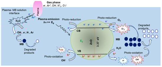 As shown, the availability of radicals determine the efficiency of the MB degradation process. Hence the addition of source radicles combined with that generated with plasma would improve the degradation of MB dye. Indeed, the MB degradation improved in the presence of the 0.2 gL−1 ZnO photocatalyst in the MB solution, as shown in Figure 6. As depicted in Figure 1, the plasma emission contains UV photons << 400 nm), which have enough energy to activate ZnO photocatalysts; electrons () move from the valence band (VB) to the conduction band (CB) and leave holes h+ in the (VB) of ZnO NPs. Both and h+ migrate to the ZnO NPs’ surface. The holes’ h+ oxides H2O and/or OH- molecules are adsorbed on the ZnO NPs’ surface and produce reactive hydroxyl radical anions () and H+ ions. Meanwhile, electrons reduced to oxygen molecules exist on the photocatalyst surface and generate super-oxide anions (· [60,61,62,63]. The might interact with H+ in the presence of H2O and generate H2O2. In addition, oxygen vacancies in the ZnO NPs (Figure 3b) act as electron donors that promote further generation of . The reactive and oxidize the MB dye molecules into de-colorized unharmful species. The possible reaction pathways for MB degradation in the presence of ZnO NPs under plasma irradiation are summarized in the following equations.